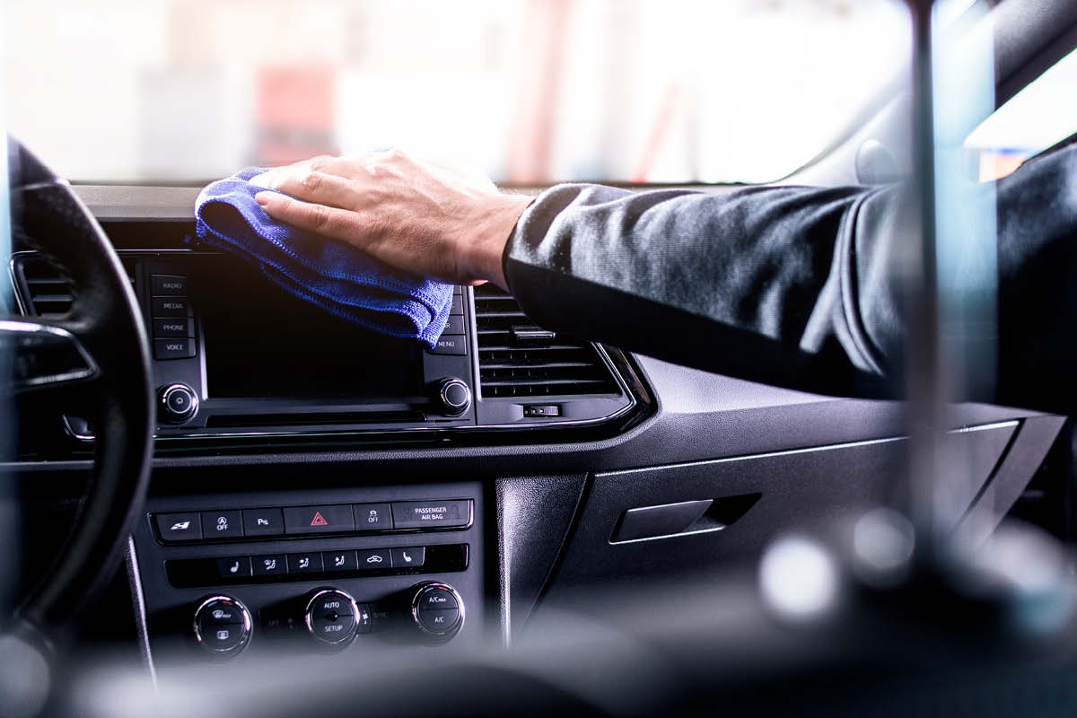 Eine Person putz mit einem blauen Lappen den Innenraum eines Auto